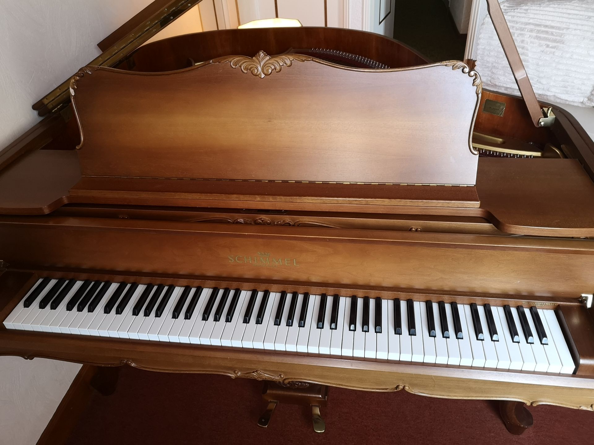 Piano 1/4 de queue de marque SCHIMMEL, numéro de série 212 300, finition noyer antique, Cadre 150 B.